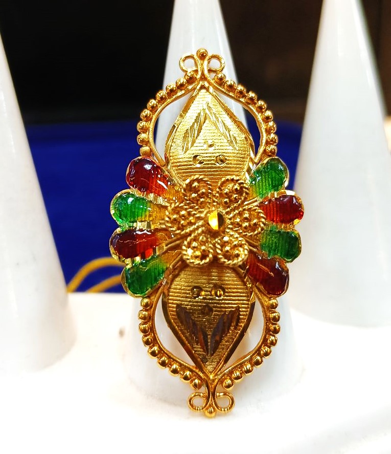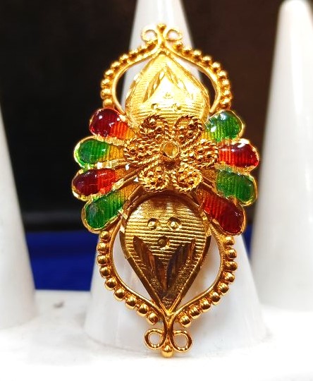 Step into bold elegance with Gaynar Baksha’s ” Full Finger Ring Red/Green “, a striking piece crafted for those who love statement jewellery. Adorned with red and green accents, this ring covers the finger beautifully, making it a standout accessory for weddings, festive occasions, or parties. Designed with precision, it represents the perfect balance of tradition and modern fashion.