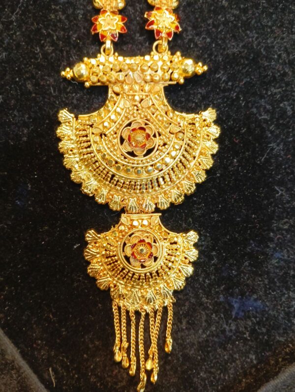 With every piece of gold plated jewelry from Gaynar Baksha, you get durability, timeless appeal, and premium quality. Our gold plated jewellery set for women with warranty ensures peace of mind while enjoying the beauty of this bold and elegant Heavy Chain Necklace.