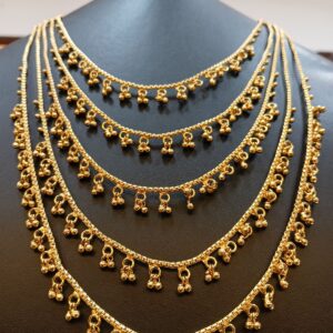 Experience grandeur and elegance with Gaynar Baksha’s ” Lahori 5 Layer Chain Necklace Set “, a stunning piece that combines intricate craftsmanship with modern style. Featuring five beautifully layered chains, this necklace set creates a regal and sophisticated look, perfect for weddings, festive occasions, or special celebrations. Recognized for premium gold plated jewellery in Kolkata, Gaynar Baksha is a trusted name among gold plated jewellery wholesalers, delivering designs that reflect quality, style, and durability.